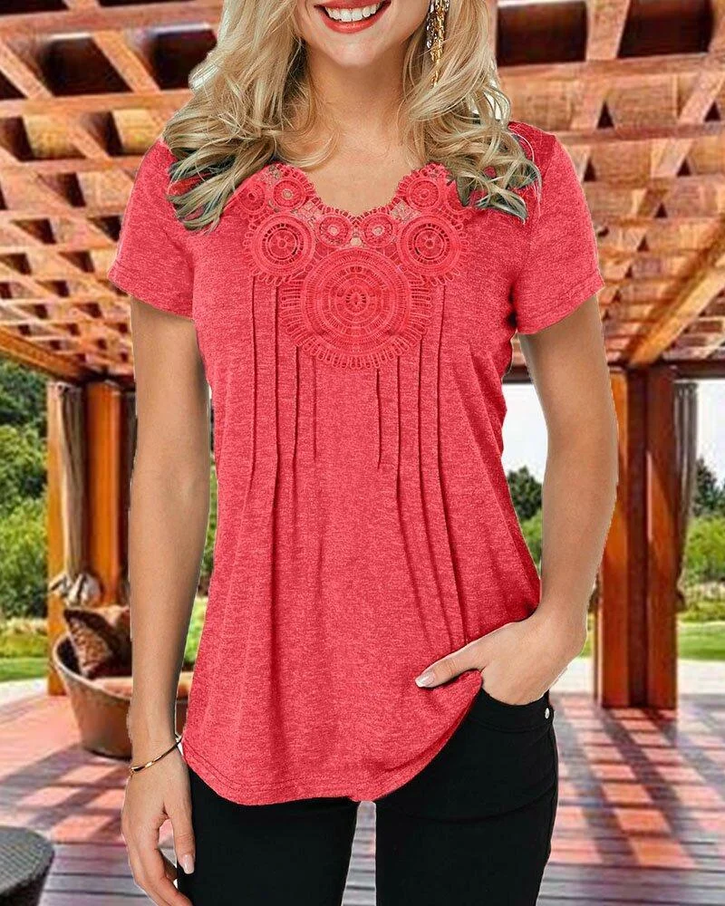 Crinkle Chest Coral Red Short Sleeve T Shirt